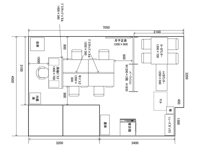 壁とチェアの空間確保のため平デスクは1200×600を選定。
