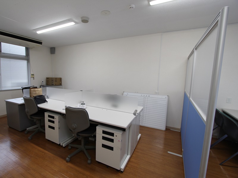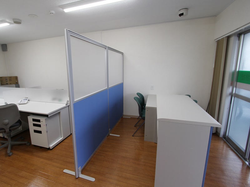 事務所内と受付を仕切るパーティションの上部は半透明アクリルなので、圧迫感は無い。